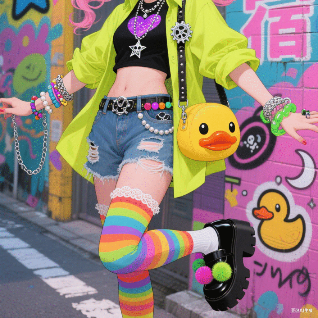 在原宿風中,配件扮演著畫龍點睛的角色。誇張的厚底鞋、繽紛的襪子、多層次的手鍊、搞怪的卡通包包,這些充滿個性的配件能讓你的穿搭瞬間變得與眾不同,展現出獨特的審美觀。